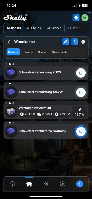Zelf een standaard elektrische verwarming omgebouwd naar een op afstand controleerbaar apparaat via de app van Shelly. Vervolgens kan het apparaat opgenomen worden in de Smart-home omgeving van Homey. Uiteindelijk doel is om overtollige opbrengst van de zonnecollectoren om te kunnen zetten naar extra warmte als de kamertemperatuur dit aangeeft.